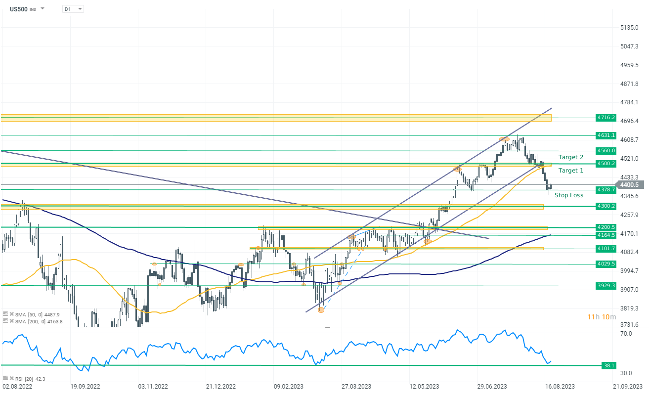 كانت الأسابيع الثلاثة الماضية مليئة بالكثير من الأخبار السلبية في الأسواق المالية. وقد أدى هذا إلى تدهور كبير في المعنويات وتراجع بنسبة 5.0٪ في مؤشر US500 من أعلى مستوياته في 31 يوليو 2023. كسر مؤشر US500 اتجاهه الصعودي طويل الأجل ، مما يشير إلى ضغط هبوطي قوي. ومع ذلك ، أدى تراكم الأخبار إلى حالة ذروة البيع على المدى القصير في الأسهم. إلى جانب التحليل الفني للرسم البياني ، فإن هذا يخلق مجالًا للارتداد نحو 4500 نقطة. أوقف المؤشر تراجعه عند منطقة دعم رئيسية عند مستوى 4378 نقطة.