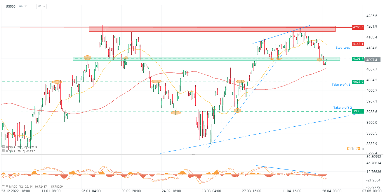 يتداول مؤشر US500 حاليًا عند 4098 نقطة ، بعد أن ارتد مؤخرًا من مستوى المقاومة العلوي عند 4200 نقطة. ثم انخفض السعر بعد ذلك إلى مستوى الدعم بالقرب من 4100 نقطة ثم اخترق بعد ذلك هذا المستوى مشيرًا إلى حركة قوية. مع ذلك ، ارتد السعر بعد ذلك من المتوسط المتحرك البسيط لـ 50 يومًا (SMA) ويحوم الآن بالقرب من قناة الدعم حول 4100 نقطة ، والتي تعتبر الآن مستوى مقاومة محتمل.