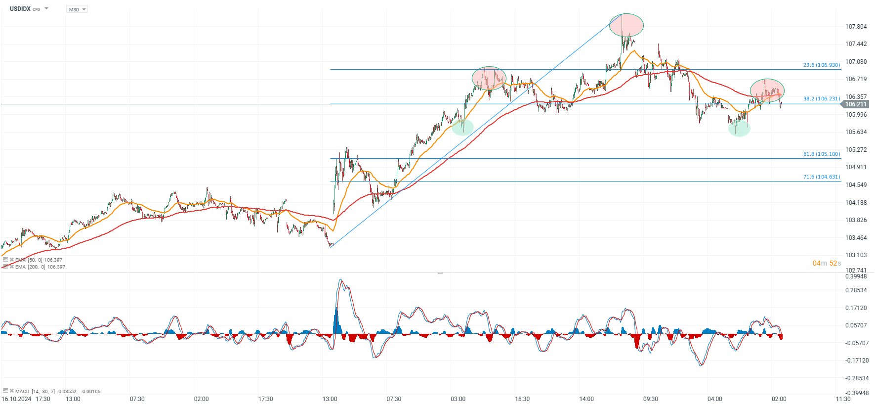 - على الرسم البياني لـ USDIDX، يمكننا أن نرى نمطًا فنيًا محتملاً للرأس والكتفين؛ من ذروة محلية فوق 108.1، انخفض الدولار إلى 106.2