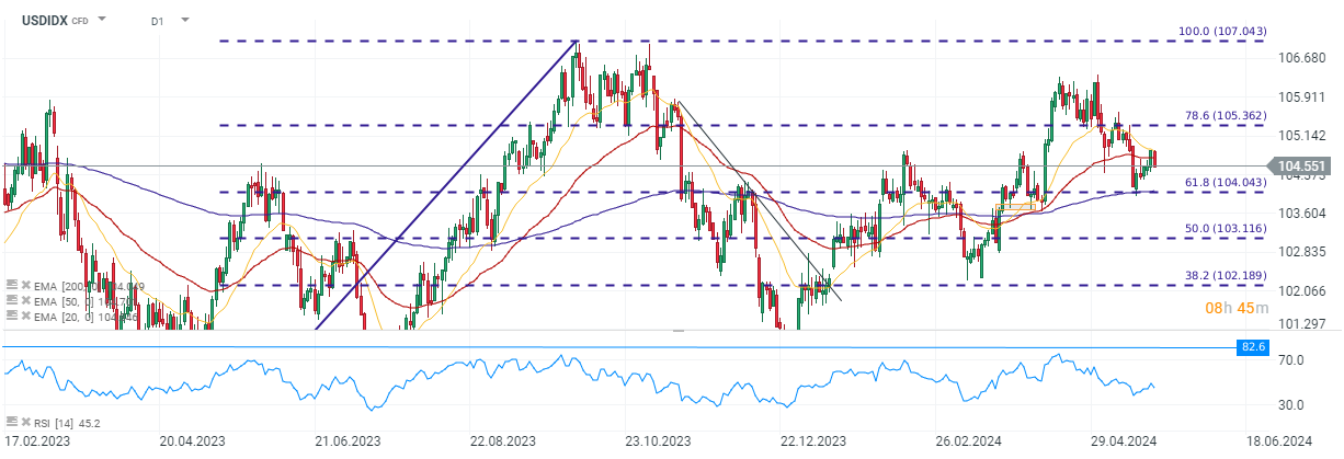 اعتبر المستثمرون محضر اجتماع اللجنة الفيدرالية للسوق المفتوحة متشددًا إلى حد ما. وأشار بعض أعضاء اللجنة الفيدرالية للسوق المفتوحة إلى أن المستوى الحالي للسياسة النقدية قد لا يكون كافياً لخفض التضخم إلى المستوى المستهدف. وهذا يدل على أنه حتى قبل التعليقات الأخيرة، كان أعضاء اللجنة الفيدرالية للسوق المفتوحة متشددين بشأن توقعات السياسة النقدية. وقال والر من مجلس الاحتياطي الفيدرالي إنه سيحتاج إلى قراءات متعددة "جيدة" للتضخم للنظر في خفض سعر الفائدة. أظهرت قراءة التضخم الأخيرة فقط أن التضخم توقف عن الارتفاع. من الناحية الفنية، يرتد الدولار من الحد الأدنى لقناة الاتجاه وتكون مراكز المضاربة منخفضة نسبيًا مما قد يكون إشارة متناقضة. وحتى قرارات يونيو/حزيران التي ستتخذها العديد من البنوك المركزية، من المرجح أن تضعف العديد من العملات مقابل الدولار، مما يتيح التعرض للقرارات الحذرة المحتملة من الفدرالي.
