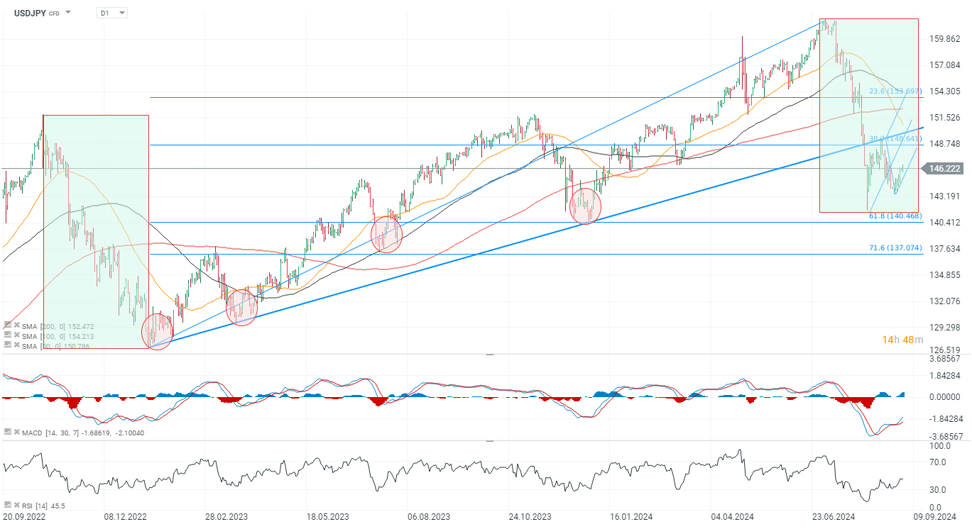 يشير السعر المتوسط الذي يشير إليه أندروز إلى أن الارتداد في الين (إذا حدث) يجب أن يكون "مائلًا رأسيًا"، مما يشير إلى تقلبات مرتفعة في بيئة صاعدة. من ناحية أخرى، قد يدعم التباعد المتزايد بشأن التحول المتوقع في السياسة من جانب بنك الاحتياطي الفيدرالي (دورة من تخفيضات أسعار الفائدة تبدأ في سبتمبر وربما تخفيف بمقدار 100 نقطة أساس في عام 2024) وبنك اليابان (هناك المزيد من رفع أسعار الفائدة على الطاولة، من مستويات منخفضة للغاية تاريخيًا) الاتجاه الهبوطي. خط الدعم الرئيسي لزوج الدولار الأمريكي/الين الياباني هو 140. قد تؤدي بيانات سوق العمل الأمريكية إلى زيادة التقلبات في الزوج، ومن المرجح أن تضع المزيد من الإصدارات القوية من الولايات المتحدة المزيد من الضغوط على الين وربما تدعم عائدات السندات الأمريكية إذا قلص السوق النطاق المتوقع لخفض أسعار الفائدة في عام 2024.