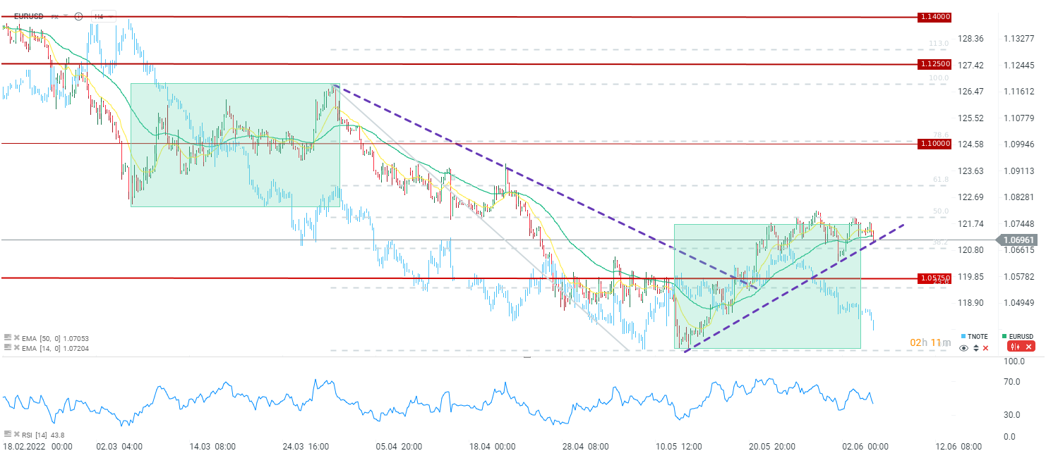 يحتل زوج EURUSD مكانة مهمة ، وتحديداً عند دعم خط الاتجاه الصعودي. و يتداول اليورو مقابل الدولار الأميركي بانخفاض مع ارتفاع حاد في العوائد ، حيث اخترقت عوائد السندات لأجل 10 سنوات 3٪ مرة أخرى وبلغت أعلى مستوياتها منذ شهر ابريل / مايو. ومن المثير للاهتمام ، أنه كانت هناك توقعات متفائلة للغاية فيما يتعلق بقرار البنك المركزي الأوروبي. و يتوقع باركليز زيادة قدرها 25 نقطة أساس في كل اجتماع هذا العام وواحد في العام المقبل. و من ناحية أخرى ، يشير بنك أمريكا إلى 150 نقطة أساس هذا العام ، مع ارتفاعين بمقدار 50 نقطة أساس في شهر يوليو وسبتمبر. و على الرغم من هذه التوقعات المتطرفة ، فإن اليورو ليس قوياً للغاية. و الدولار في حالة هجوم بفضل البيانات الجيدة من سوق العمل ، والتي تظهر أنه على الرغم من بعض علامات التباطؤ ، فإن الاقتصاد صامد بشكل جيد.