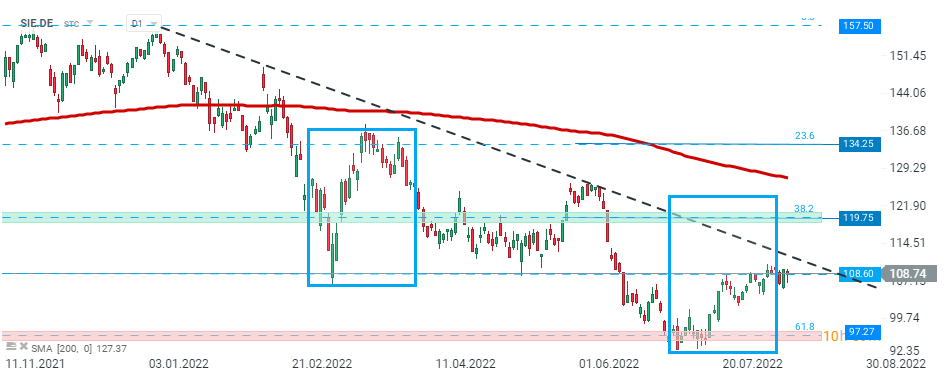 انخفض سهم سيمنز (SIE.DE) في البداية بعد النتائج الفصلية المتشائمة ، لكن المشترين تمكنوا من محو معظم الخسائر. مع ذلك ، طالما ظل السعر تحت خط الاتجاه الهبوطي ، فإن المعنويات الرئيسية لا تزال هبوطية. المصدر: xStation5