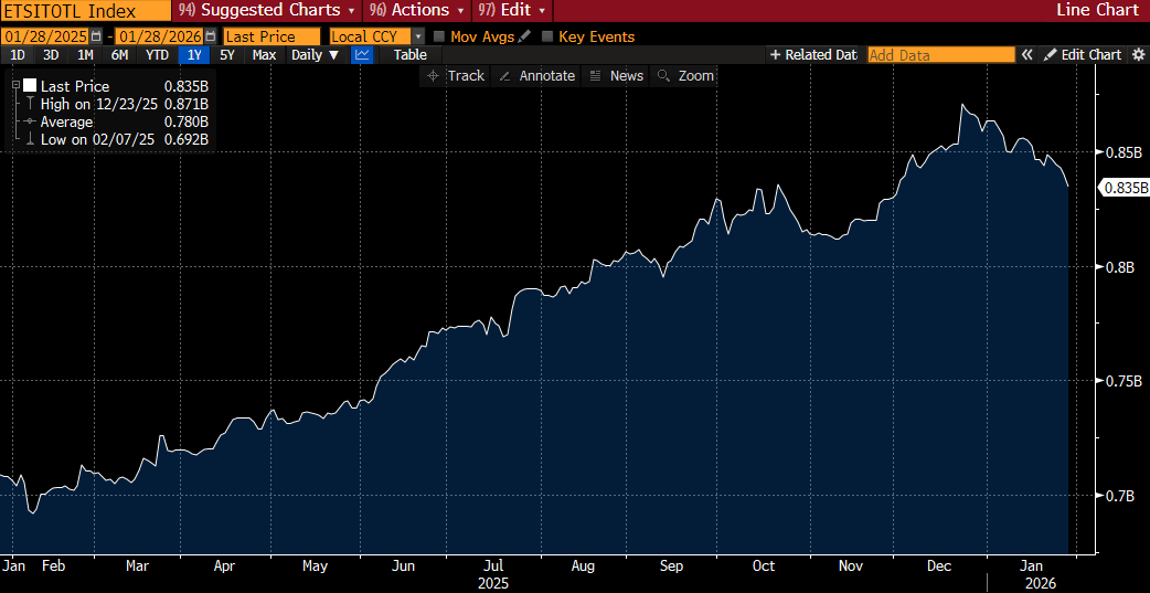 يشهد سوق الفضة تباينًا واضحًا بين تدفقات المؤسسات وطلب الأفراد. فقد خفضت صناديق الاستثمار المتداولة في الفضة حيازاتها بنحو 5.1 مليون أونصة تروي في الجلسة الأخيرة، مسجلةً بذلك اليوم الخامس على التوالي من التدفقات الخارجة، ما رفع صافي المبيعات الإجمالية منذ بداية العام إلى ما يقارب 29 مليون أونصة. ويشير هذا إلى جني الأرباح أو إعادة توازن المحافظ الاستثمارية من قبل كبار المستثمرين بعد ارتفاع قوي استثنائي في الأسعار. وعلى الرغم من ذلك، لا تزال النظرة العامة للمعادن النفيسة إيجابية، مدعومةً بضعف الدولار الأمريكي، والتوقعات بشأن السياسة النقدية الأمريكية، وتزايد حالة عدم اليقين الجيوسياسي - وهي عوامل تدعم سوق المعادن النفيسة ككل، بما في ذلك الذهب.
