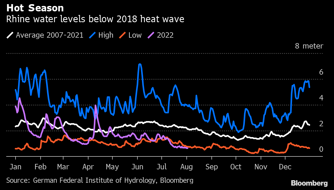 تستمر مستويات المياه في نهر الراين في الانخفاض ، مع تزايد صدى المخاوف بشأن توقف الشحن لدى الجمهور. في مدينة كاوب الألمانية ، انخفض منسوب المياه إلى أدنى مستوى له في 2018 بما يزيد قليلاً عن 60 سنتيمترًا يوم الثلاثاء. سيترجم انخفاض أقل من 40 سم إلى توقف في الشحن ، مما يؤدي إلى تفاقم أزمة الطاقة في القارة القديمة (يعد نهر الراين مركزًا استراتيجيًا لنقل الفحم ، من بين أمور أخرى). في عام 2018 ، تُرجمت حالة النهر المنخفضة إلى انخفاض بنسبة 0.4 ٪ في الناتج المحلي الإجمالي لألمانيا.