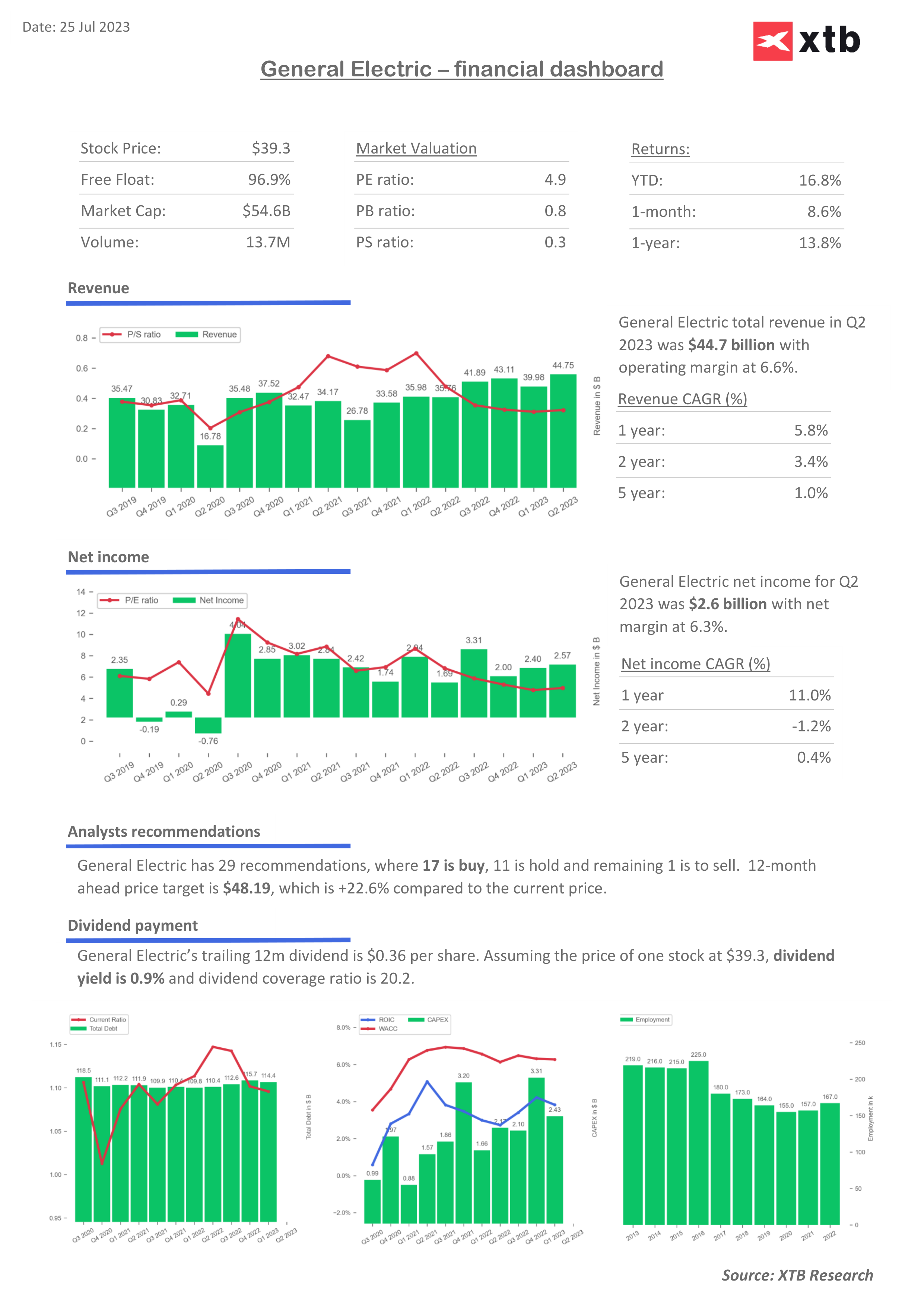 ارتفعت أسهم جنرال إلكتريك (GE.US) بنسبة 4.75٪ في تعاملات ما قبل السوق بعد أن أعلنت الشركة عن أرباح أعلى من المتوقع للربع الثاني. تجاوز التقرير المالي تقديرات المحللين مشيرًا إلى مبيعات أمريكية أقوى من المتوقع ، لا سيما نماذجها الأكثر ربحية. شهدت الشركة نموًا مزدوجًا في الطلبات والإيرادات ، مدعومًا بنمو قوي في الخدمات عبر محفظتها ، وزيادة الطلب في GE Aerospace ، وعدد قياسي من طلبات الطاقة المتجددة. أشار الرئيس التنفيذي إلى أن GE Aerospace و GE Vernova تستعدان لتصبحا شركتين مستقلتين ، ومن المحتمل أن تكون في أوائل عام 2024.