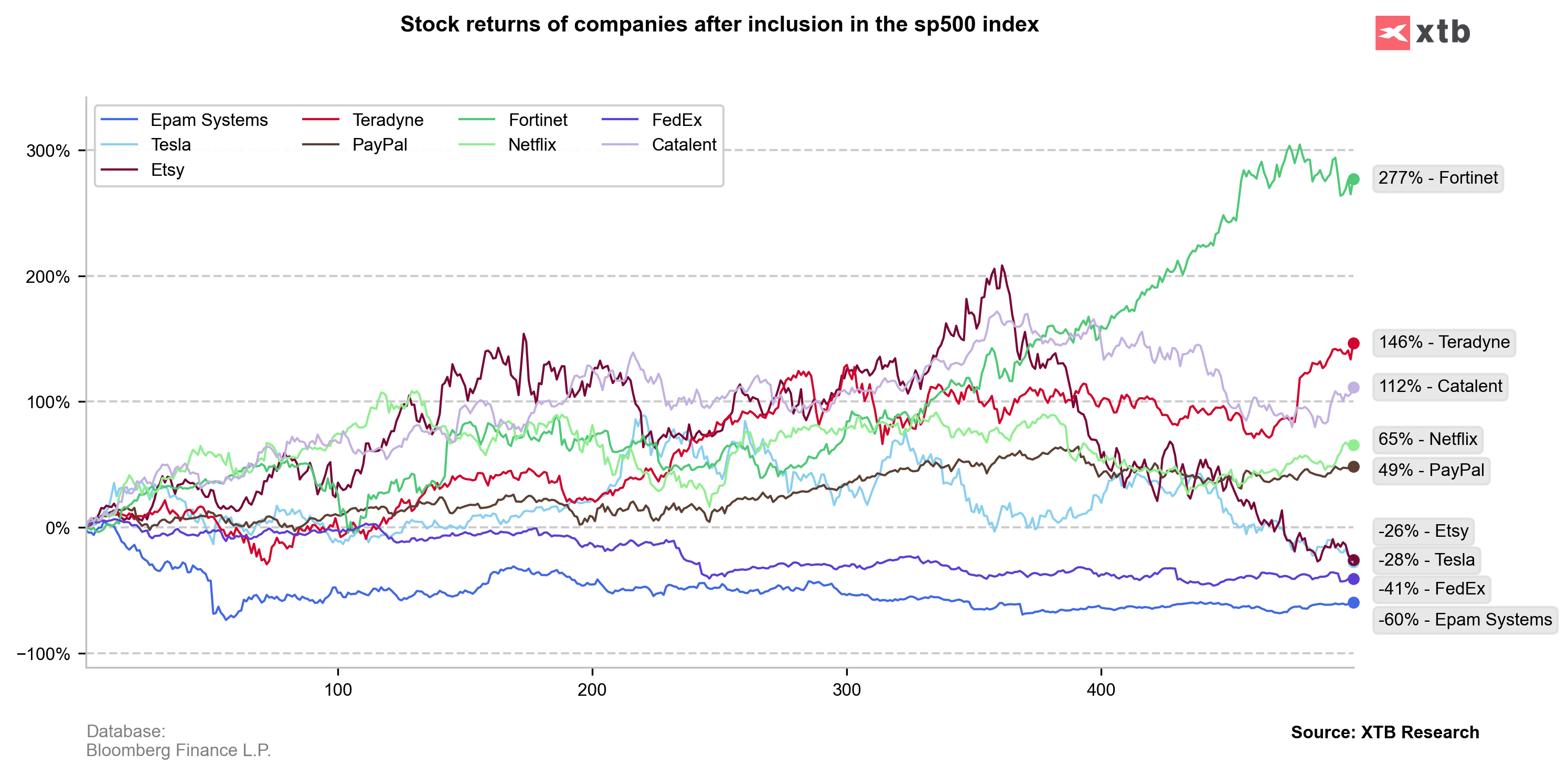 تاريخيًا، أدى الانضمام إلى مؤشر S&P 500 إلى دعم معنويات الأسهم مؤقتًا، لكن هذا في حد ذاته لا يحدد "نجاح" سوق الأسهم للشركة. على سبيل المثال، خسرت شركة تسلا ما يقرب من 30% منذ ظهورها لأول مرة. وتبين أيضًا أن ظهور Epam Systems لأول مرة في العام الماضي كان ضعيفًا بشكل استثنائي، وبعد لحظات من الزيادات، تم تحفيز العرض، الذي سيطر على السهم حتى يومنا هذا. المصدر: أبحاث XTB، بلومبرج فاينانس إل بي