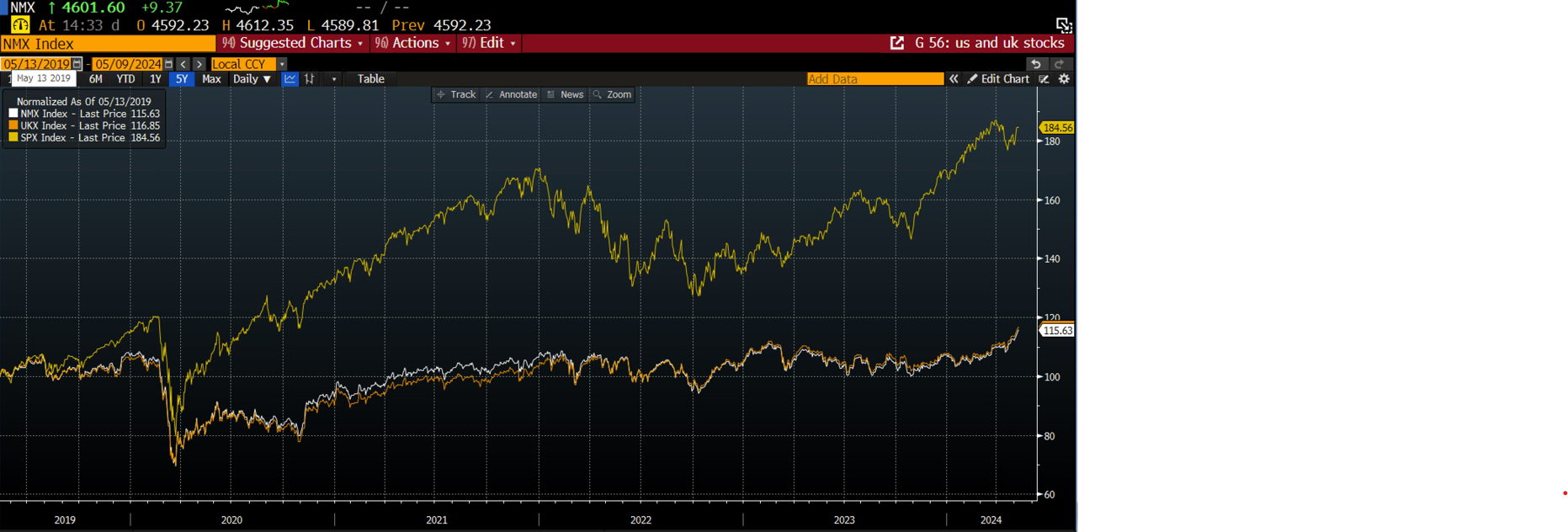 ارتفعت أسعار الأسهم عند اجتماع بنك إنجلترا أكثر من غيره، ووصل مؤشر FTSE 100 ومؤشر FTSE 350 إلى مستويات قياسية جديدة خلال اليوم على خلفية هذا التقرير. تتلاشى الأسهم قليلاً مع تحركنا نحو نهاية الجلسة الأوروبية، ربما لأن بنك إنجلترا لن يلتزم بتخفيض يونيو. ومع ذلك، نعتقد أن هذا التقرير قد يكون إيجابيًا للأسهم البريطانية على المدى الطويل. وتشير توقعات الناتج المحلي الإجمالي والتضخم الواردة في التقرير إلى أن اتجاه تراجع التضخم في المملكة المتحدة يمكن أن يستمر عند مستوى التوظيف الكامل تقريبًا، ومن المقرر أن يتحسن مسار النمو باستمرار على مدى السنوات الثلاث المقبلة. ومن المتوقع أن ينخفض مؤشر أسعار المستهلك إلى هدف بنك إنجلترا في عام 2026، أي قبل عام مما كان متوقعًا في تقرير فبراير. يرسم بنك إنجلترا خلفية اقتصادية إيجابية لمستقبل المملكة المتحدة، وهذه أخبار جيدة للأسهم البريطانية.