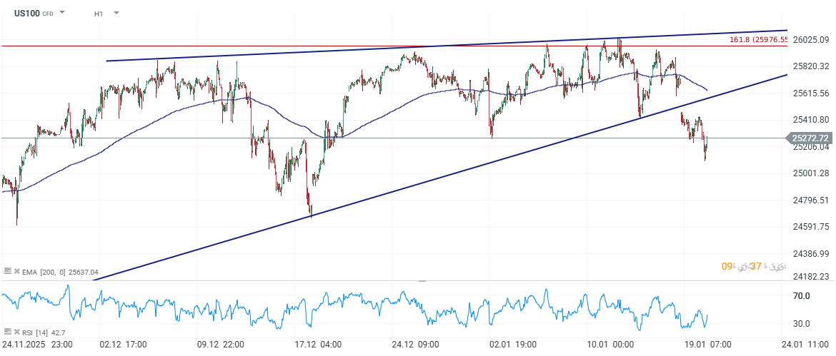تزايد التوتر السياسي بين الولايات المتحدة وبعض الدول الأوروبية حول جزيرة غرينلاند يُعد عامل مخاطرة إضافيًا، ولو بشكل غير مباشر. هذا النوع من التوترات الجيوسياسية قد يرفع مستوى عدم اليقين في الأسواق العالمية، ويعزز توجه المستثمرين نحو الأصول الآمنة على حساب أسهم النمو، ما قد يضغط مؤقتًا على مؤشرات مثل ناسداك 100 في فترات تصاعد الأخبار أو التصريحات السياسية.
