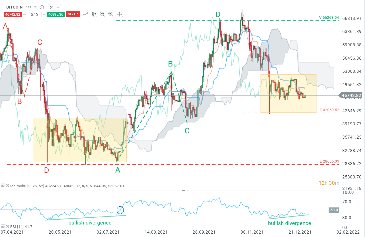 عند النظر إلى الرسم البياني اليومي مع Ichimoku، يمكننا أن نرى أوجه التشابه مع بداية صيف 2021 (المربع الأصفر الأول) - اتجاه جانبي تحت السحابة اليومية. في ذلك الوقت ، كان تقاطع السحابة بمثابة إشارة للانتعاش الصعودي الذي أدى إلى قمم جديدة. يظهر نموذج مؤشر القوة النسبية أيضًا مشابهًا ، مع تشكل تباعد صعودي. كان اختراق مستوى 50 إشارة من أنماط إيشيموكو. لذلك إذا كسر مؤشر القوة النسبية 50 ودخلت الأسعار إلى السحابة ، فقد ينذر هذا بخروج من السحابة وبالتالي إشارة شراء قد تسمح للبيتكوين بالعودة إلى أعلى مستوياتها. ومع ذلك ، لا يمكن استبعاد العودة إلى الدعم عند 42000 دولار ، ويمكن أن يؤدي اختراق هذا المستوى إلى انخفاض أعمق.