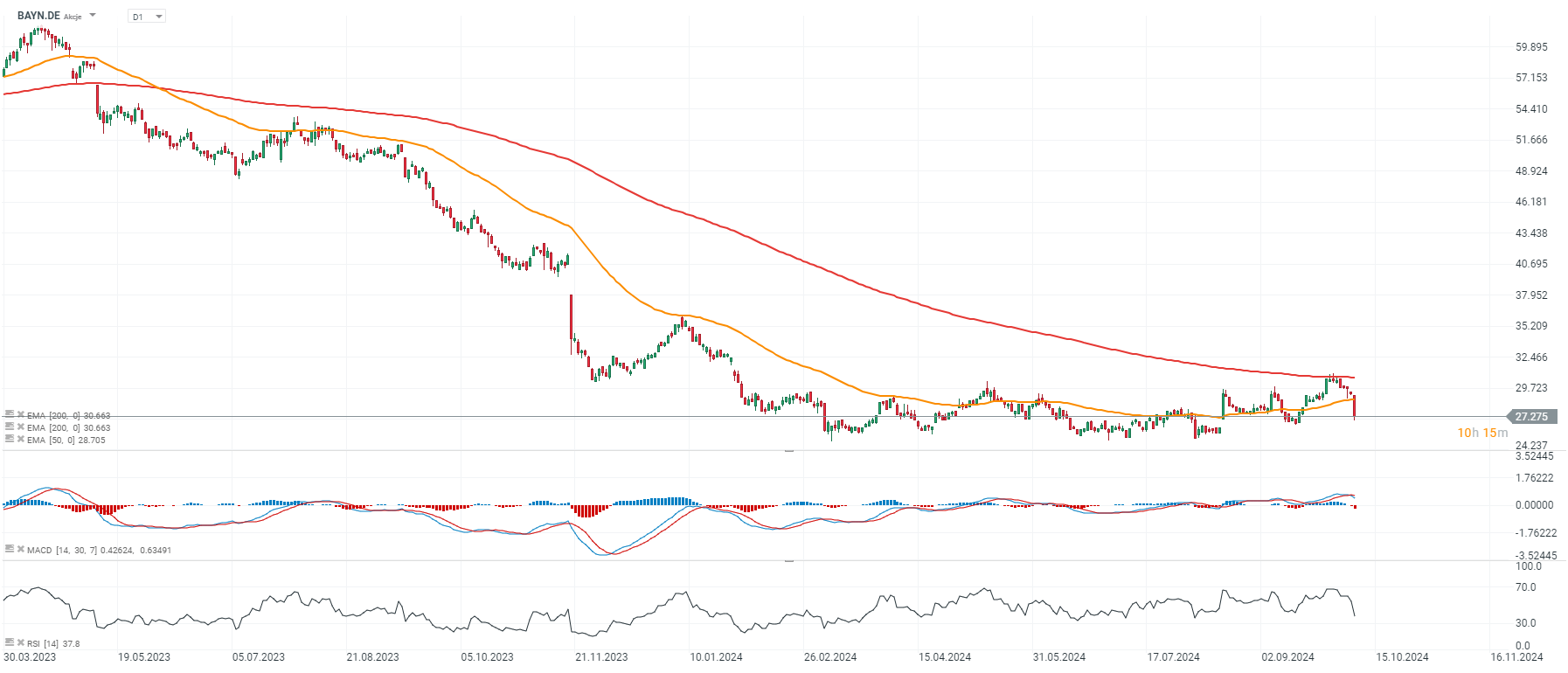 كما نرى أدناه، فشلت أسهم باير في اختراق مستوى مقاومة المتوسط المتحرك الأساسي 200 (الخط الأحمر) وهي الآن تتراجع إلى مستويات لم نشهدها منذ النصف الأول من سبتمبر.