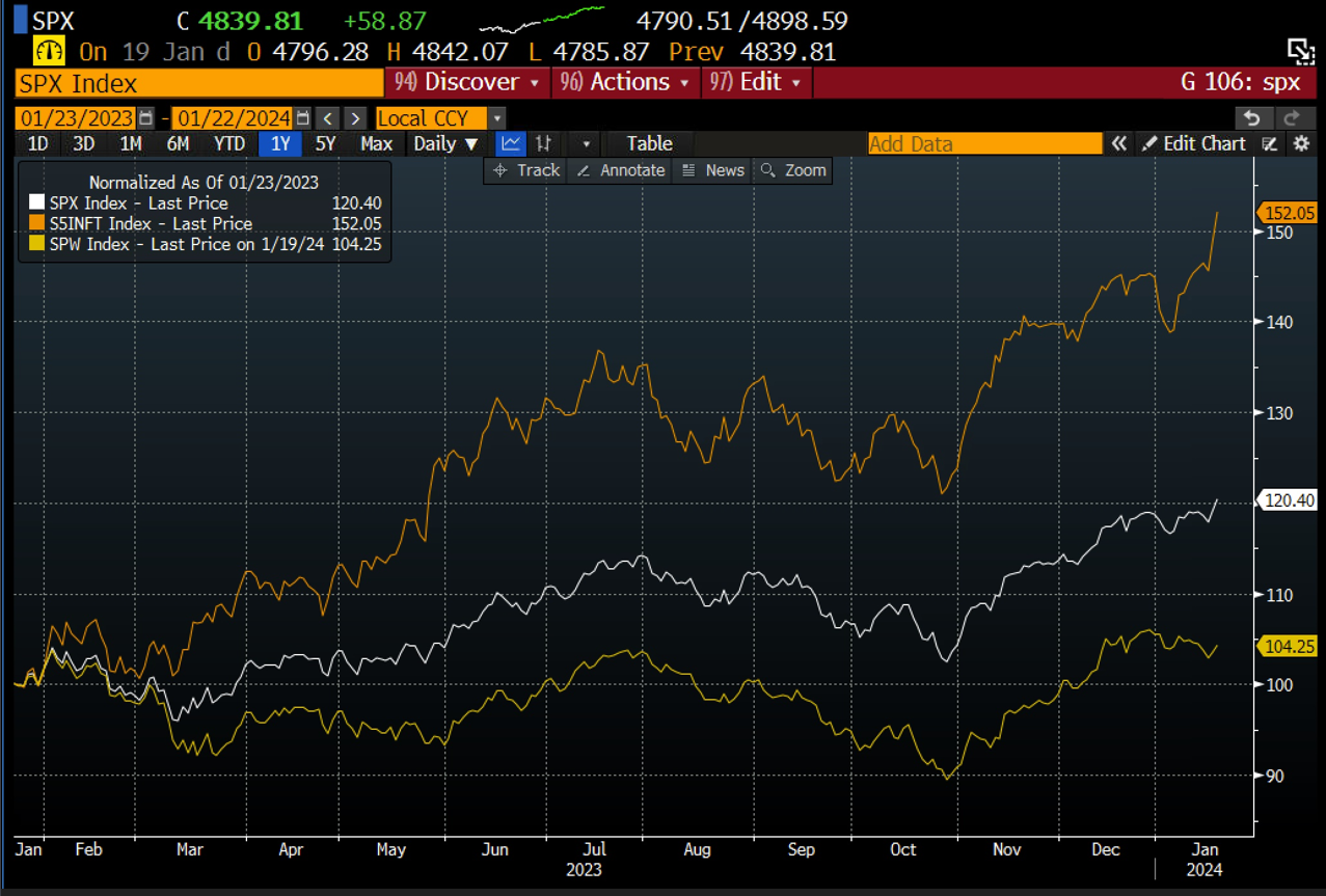 Looking at earnings season first. Big tech profit growth dominance is a major driver of the S&P 500 so far this year. The magnificent 7 are expected to deliver earnings growth of 46% in Q4, according to Bloomberg. This is down from Q3’s 53%, however, it is still significantly higher than other sectors in the S&P 500. The chart below shows the performance between the S&P 500, the IT sector within the S&P 500 and the equal-weighted S&P 500, which strips out the over-sized impact of the mega-cap tech stocks in the index. The chart has been normalised to show how they move together. As you can see, the IT sector is racing ahead, and the equal weighted S&P 500 is lagging the overall index. Tech is still a major driver of the S&P 500 as we move through January.