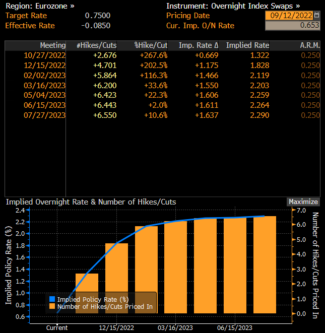 يسعر سوق المقايضة حاليًا فرصة بنسبة 68٪ لرفع سعر الفائدة بمقدار 75 نقطة أساس في اجتماع البنك المركزي الأوروبي في أكتوبر. المصدر: بلومبرج