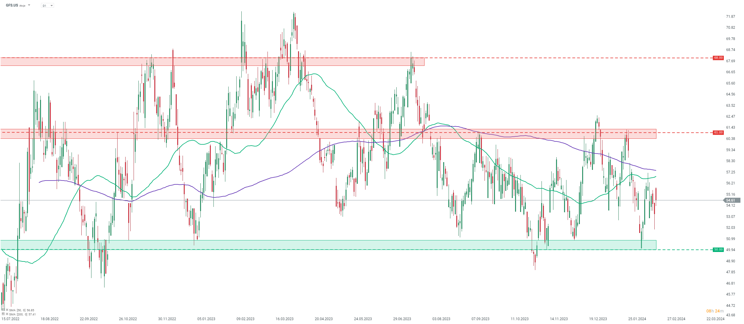 Globalfoundries (GFS.US) iniciou as negociações de hoje com um gap de alta de preços. As ações são apoiadas por notícias que dizem que irá receber grandes incentivos das autoridades dos EUA para aumentar a capacidade de produção de chips. No entanto, as ações começaram a apagar os ganhos após a abertura da sessão e a faixa de negociação de US $ 50-61 permanece intacta. Fonte: xStation5