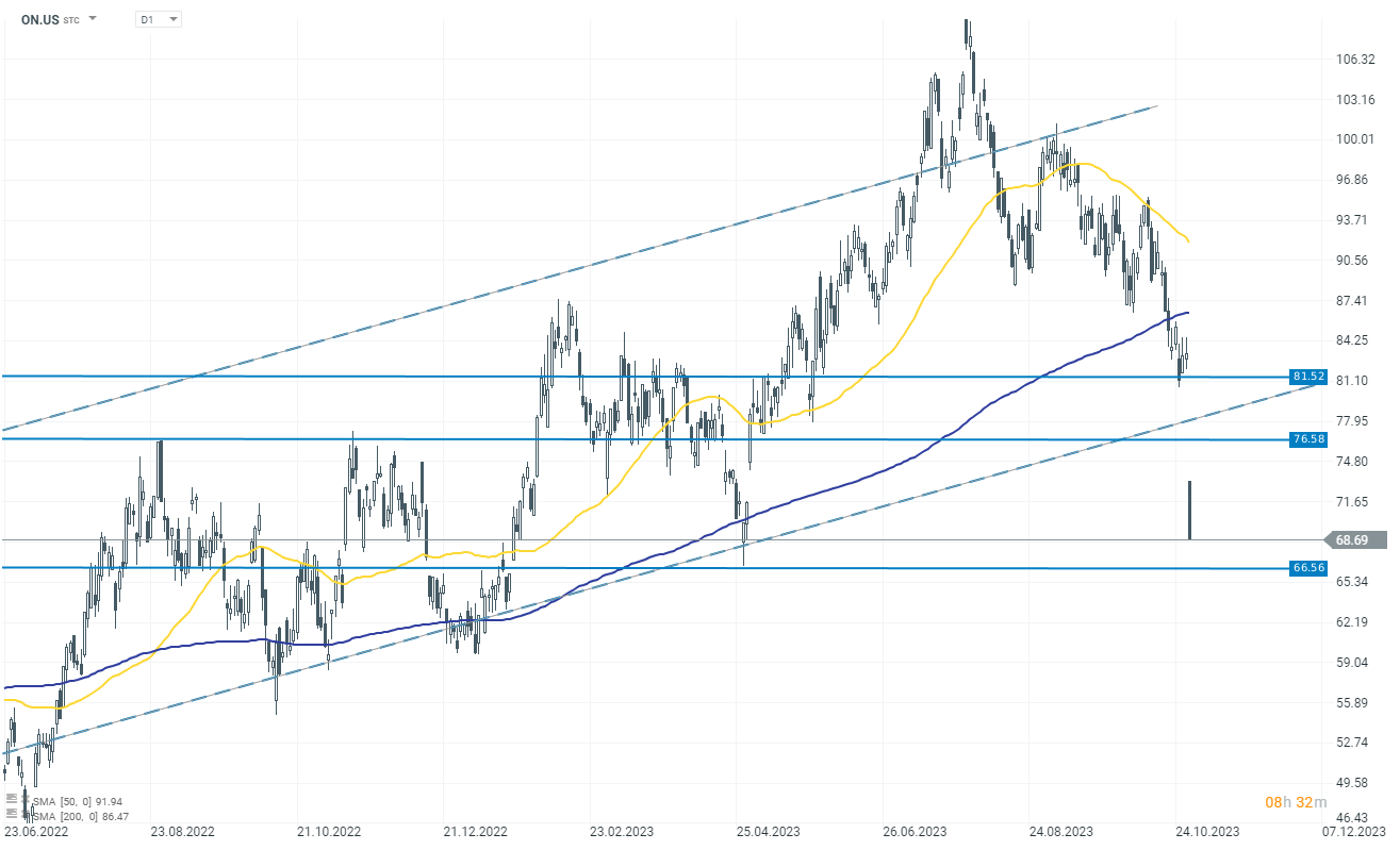 As acções da ON Semiconductor (ON.US) caíram 14% esta segunda-feira, na sequência de uma previsão para o quarto trimestre que ficou aquém das expectativas em termos de lucros e receitas ajustados, apesar de ter apresentado resultados sólidos no terceiro trimestre. As acções estão agora 34% abaixo do seu pico de agosto, sendo negociadas no seu nível mais baixo desde abril. Os analistas da William Blair, KeyBanc Capital Markets, Truist Securities e Vital Knowledge observaram que os resultados da empresa foram sólidos, mas que as perspectivas eram mais fracas do que o esperado, provavelmente devido à fraqueza do mercado industrial. As receitas do terceiro trimestre desceram ligeiramente em relação ao ano anterior, para 2,18 mil milhões de dólares, com um EPS ajustado de 1,39 dólares, em comparação com os 1,45 dólares do ano passado. As previsões para o quarto trimestre apontam para um EPS ajustado entre 1,13 e 1,27 dólares e receitas entre 1,95 e 2,05 mil milhões de dólares, ambos abaixo das estimativas. Hassane El-Khoury, o Diretor Executivo da empresa, comentou sobre a resiliência do seu negócio no meio da fraqueza do mercado.