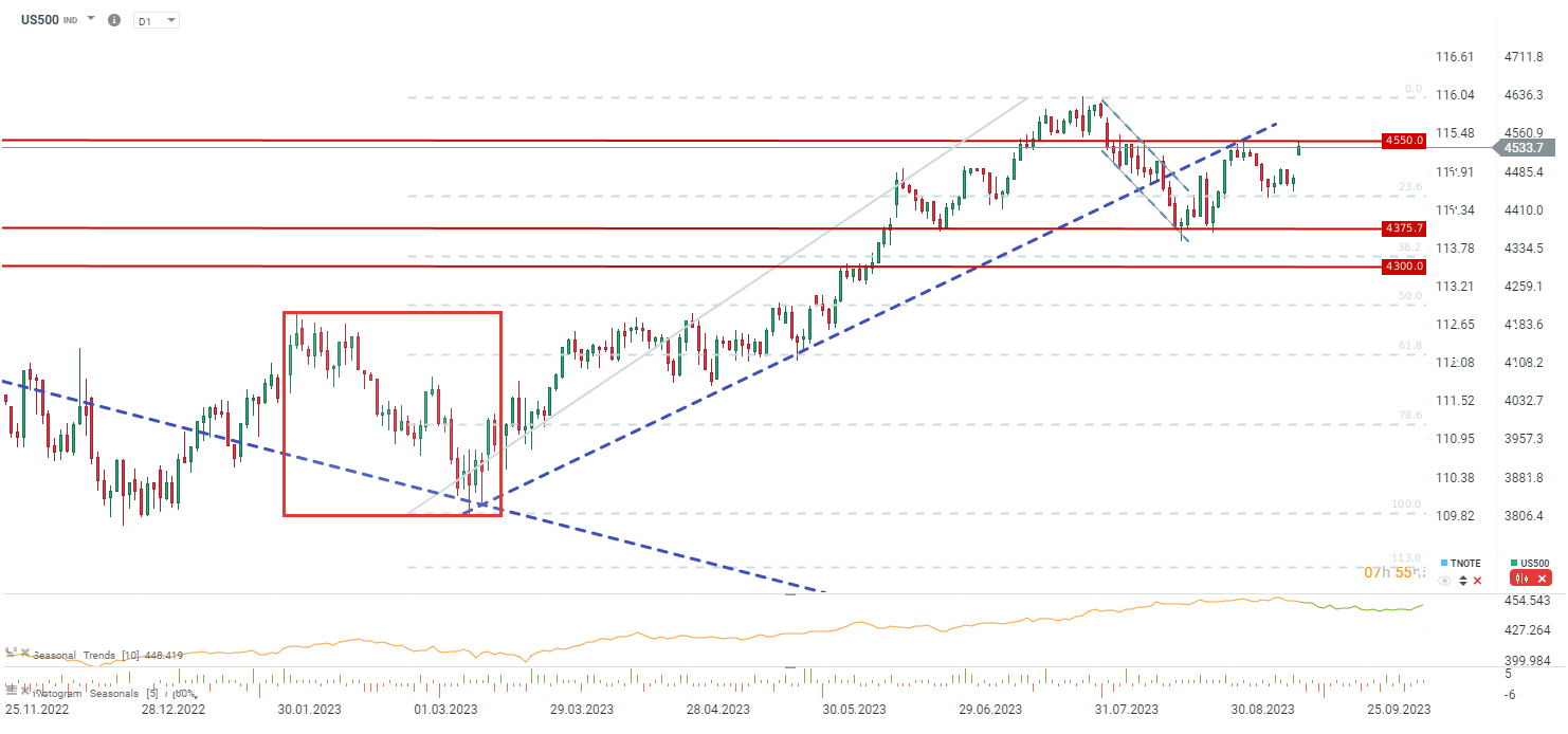 O US500 reduziu ligeiramente os ganhos após a abertura do mercado à vista. É de notar que hoje tivemos um rollover de contratos de futuros, daí a diferença de preços de aproximadamente 1%. No entanto, a criação deste intervalo pode permitir que o mercado ultrapasse a zona de consolidação em torno dos 4500-4550 pontos. Uma quebra do nível 4550 poderia levar a uma tentativa de teste de 4600 pontos. No entanto, se uma formação de velas de baixa for estabelecida hoje, o intervalo do rollover pode ser fechado e uma queda para 4.470 pontos pode ocorrer.