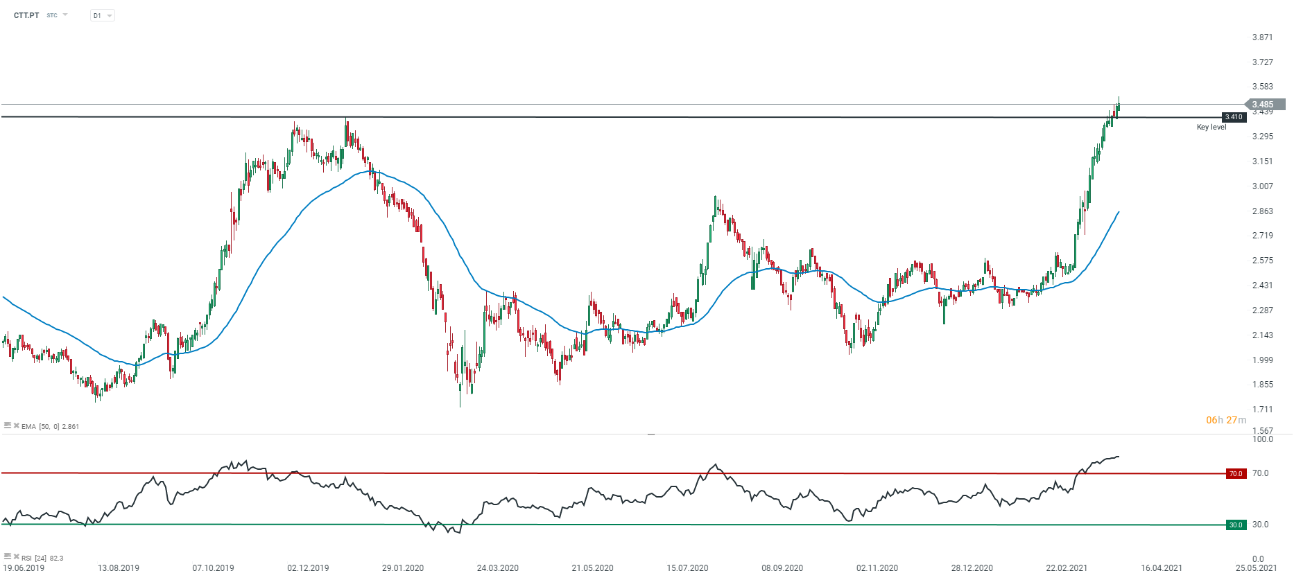 Gráfico diário, CTT (CTT.PT). Fonte: xStation 5