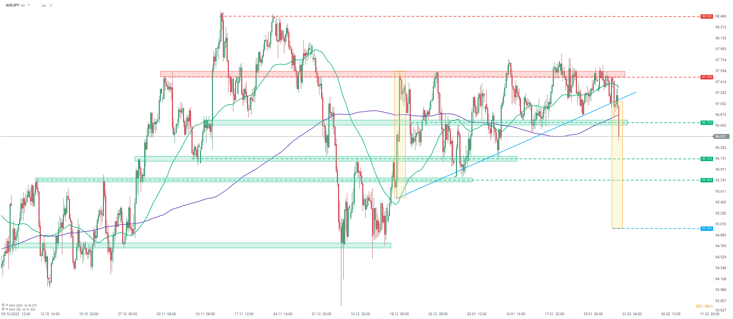 Dando uma olhada no gráfico AUDJPY no intervalo H4, podemos ver que o par caiu abaixo da linha de tendência ascendente que marcou o limite inferior de um padrão de triângulo ascendente. A gama de livros didáticos da quebra de baixa do padrão sugere a possibilidade de um movimento para tão baixo quanto 95,00 área.