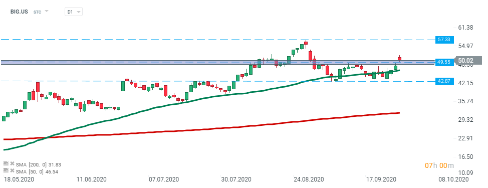 Big Lots (BIG.US) as ações aumentaram cerca de 66% durante o ano até agora, impulsionadas pela procura relacionada à pandemia. Atualmente, o preço está a testar o suporte junto dos US $ 49,55 por ação, que anteriormente atuava como uma zona de resistência. Se os compradores conseguirem ficar acima dessa zona, então poderá gerar um novo impulso de alta para US $ 57,33 por ação poderá ser lançado. Por outro lado, uma vez que os vendedores recuperem o controlo, o suporte a $ 42,87 por ação pode estar em risco. Fonte: xStation5