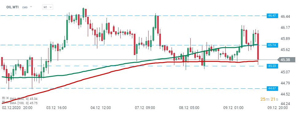 WTI Crude Oil (OIL.WTI) o preço caiu abaixo de 50 SMA (linha verde) e do nível de suporte localizado nos $ 45,74 após a divulgação do relatório EIA de hoje e está a testar atualmente o nível de suporte nos $ 45,23. Fonte: xStation5
