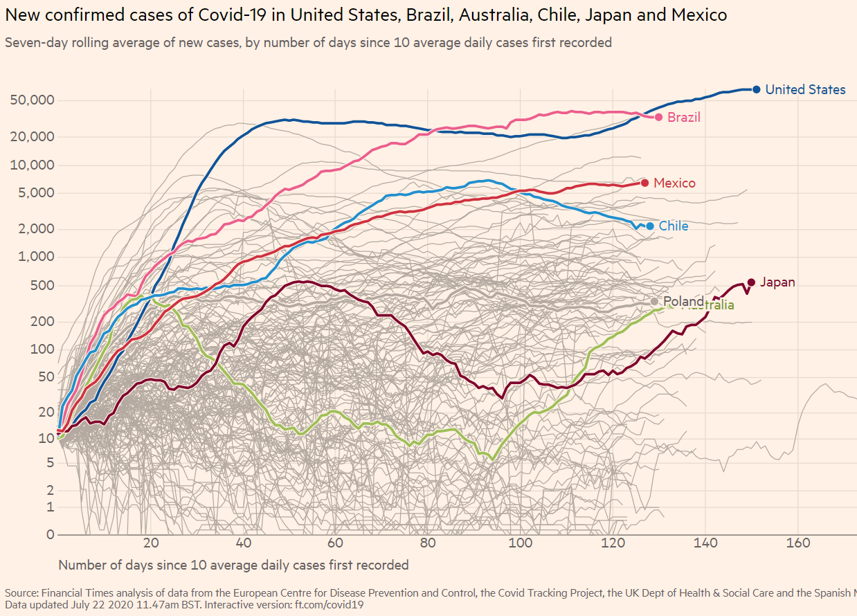 Os Estados Unidos ocupam o segundo lugar com mais casos per capita, com 120 infecções por 10.000 pessoas, superadas apenas pelo Chile. O número total de casos confirmados na América Latina ultrapassou os 4 milhões. Fonte: Financial Times