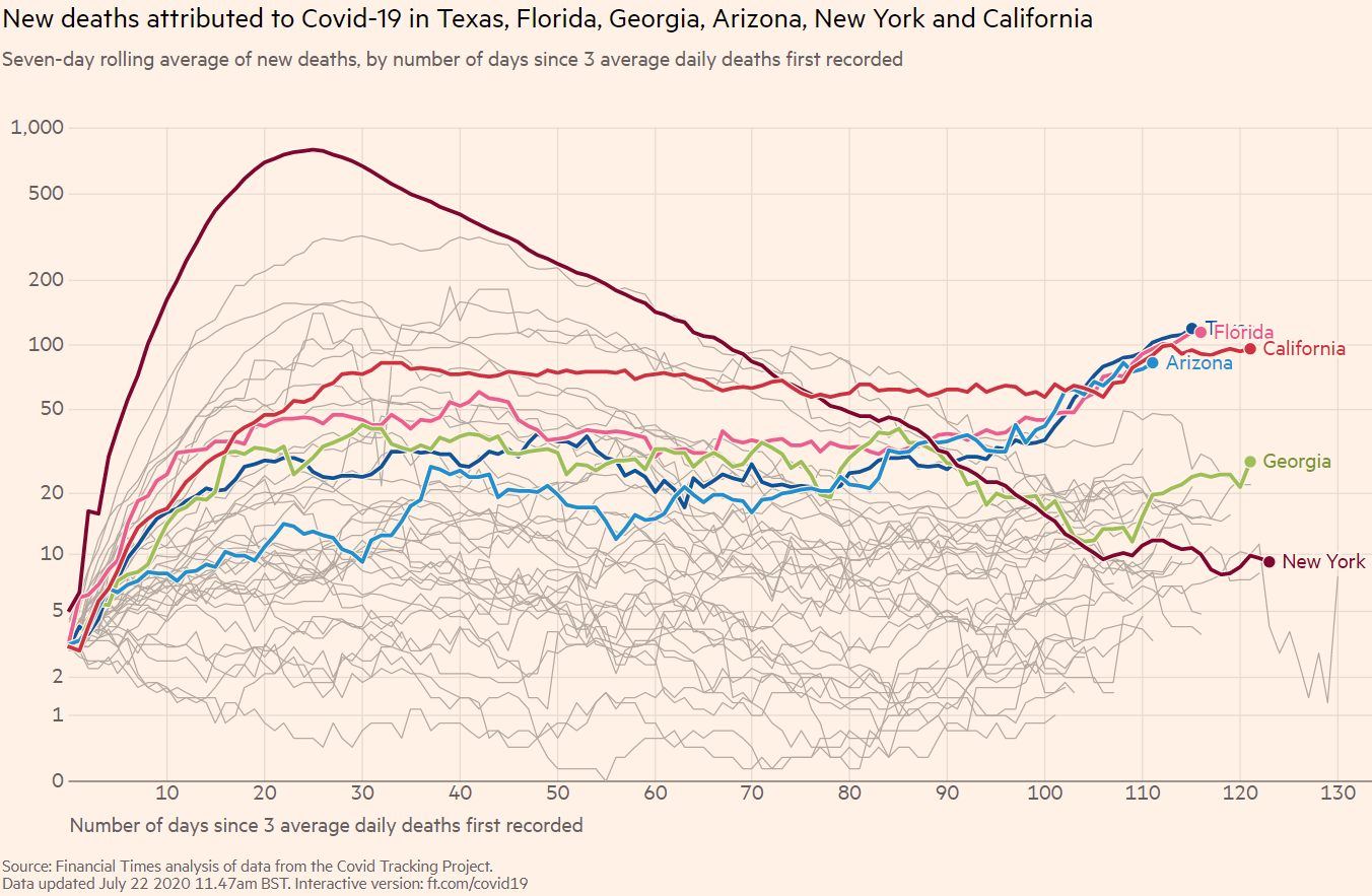 Os EUA registaram mais de 1.100 novas mortes por coronavírus pelo segundo dia consecutivo, incluindo um aumento recorde de mortes em um dia no Alabama, Califórnia, Nevada e Texas, segundo uma Reuters. Fonte: Financial Times