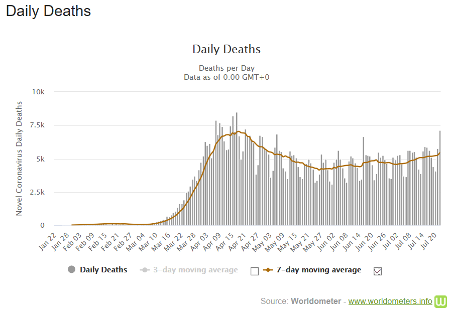 - O número de mortes começa a aumentar. Ontem, 7128 pessoas morreram devido ao coronavírus. O número de quarta-feira ficou bem acima da média de 7 dias, atualmente em 5430. Fonte: Worldometros