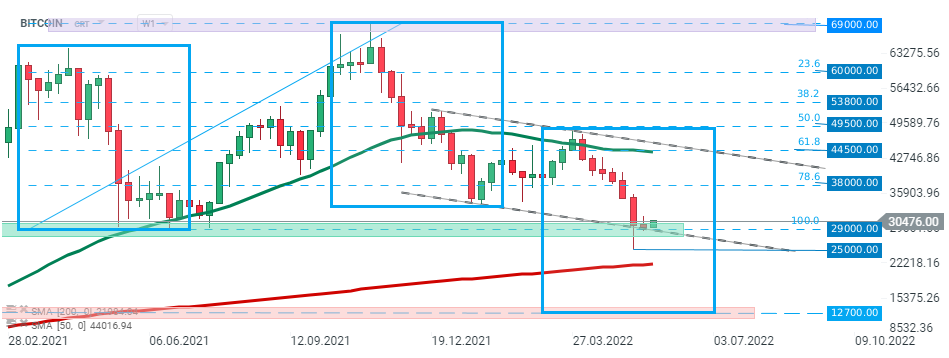 O preço da Bitcoin está a ser negociada acima da zona de suporte nos 30.000 dólares, que coincide com o limite inferior do canal descendente. Parece que apenas uma inversão acima da zona de resistência perto dos $38.000 poderia negar o sentimento de baixa. Por outro lado, se ocorrer uma quebra abaixo dessa zona, o movimento de baixa poderá aprofundar-se em direção à marca dos $25.000. Fonte: xStation5