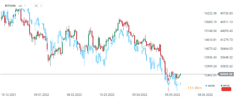 A Bitcoin tem vindo a cair durante sete semanas consecutivas, uma vez que a correlação com os mercados globais de índices de acções continua elevada. Fonte: xStation5