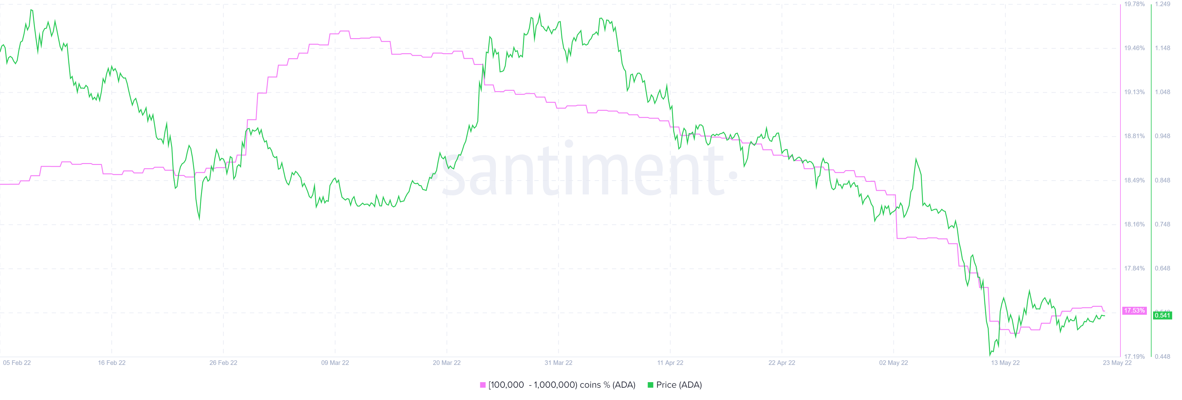 - Apesar das recentes quedas de preços, o número de "whales" cardano, que possuem entre 100.000 e 1.000.000 tokens, aumentou de 20.562 para 20.637, o que representa um aumento de 0,33%.