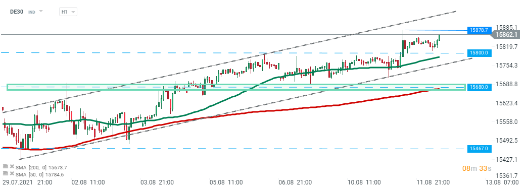 DE30 reagiu em alta junto do limite inferior do canal ascendente durante a sessão de ontem e atingiu o novo máximo histórico perto dos 15878,7 pontos. O índice voltou a testar a zona de suporte de curto prazo nos 15.800 pontos e continua a valorizar. Se a tendência de alta for mantida o índice alemão poderá prolongar os ganhos em direção ao limite superior do canal - marcando um novo máximo histórico. Fonte: xStation5