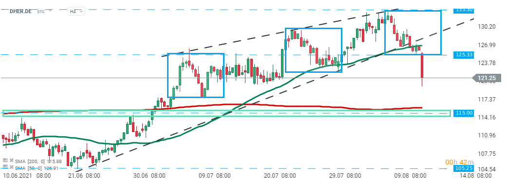 As ações do Delivery Hero (DHER.DE) quebraram abaixo do limite inferior do Rising Wedge e da SMA de 50 períodos (linha verde) durante a sessão de ontem. Durante a sessão de hoje, o movimento de baixa continua e o preço aproxima-se da próxima zona de suporte marcada pelos 115,00 euros que coincide com a SMA de 200 períodos (linha vermelha). Fonte: xStation5