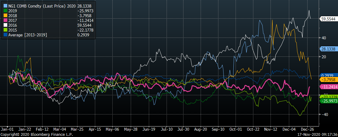 O recente aumento nos inventários está relacionado com um nível baixo de procura. E de destacar que novembro é responsável por menos de 20% de todo o período de aquecimento, portanto, muita coisa ainda pode mudar. Fonte: Bloomberg