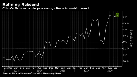 Os níveis de procura de petróleo na China está a aumentar. Com isso, os inventários de petróleo estão a diminuir, mas a mesma tendência é perceptível no caso dos derivados de petróleo. Fonte: Bloomberg