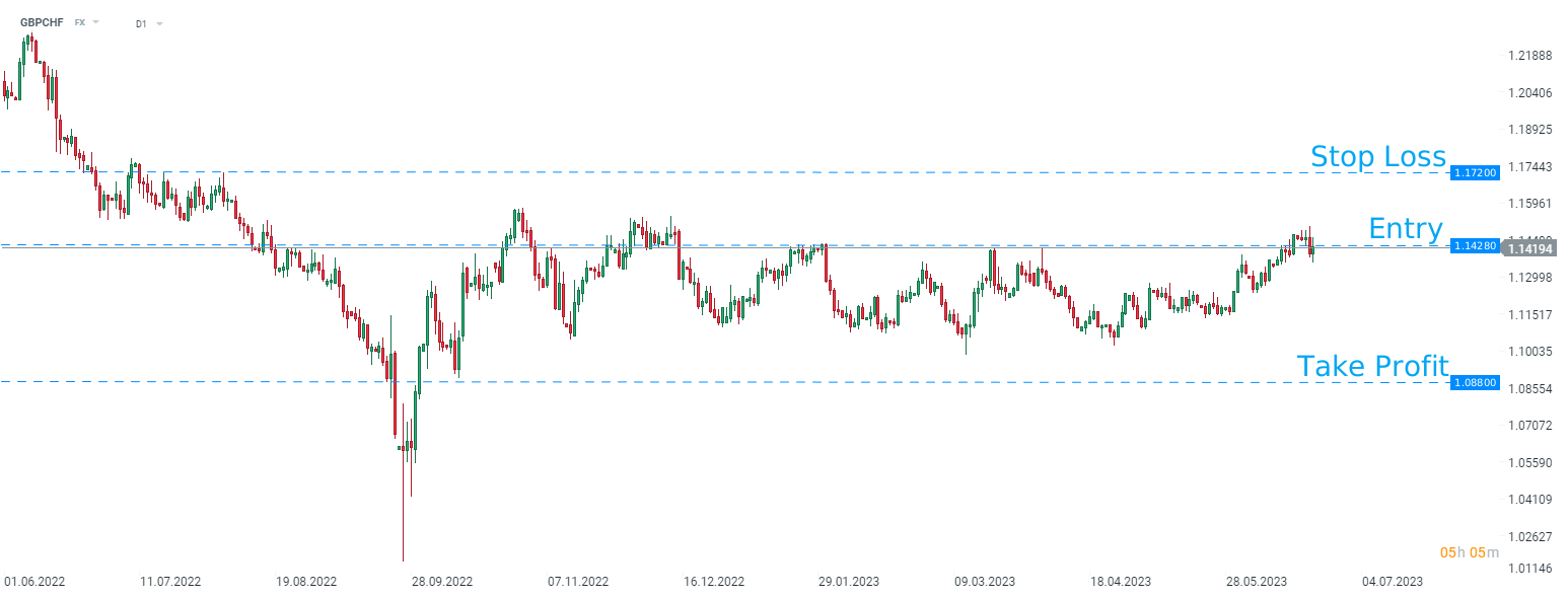 O Danske recomenda colcoar uma posição curta sobre GBPCHF a preço de mercado com um objetivo de 1.0880 e uma ordem de stop loss colocada em 1.1720. Fonte: xStation5
