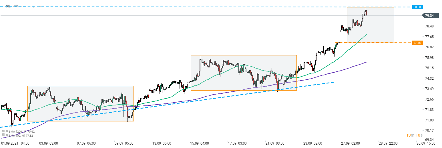 O petróleo Brent (OIL) continua a valorizar e durante a noite esteve a testar a marca de 80 dólares por barril - o nível mais alto desde Outubro de 2018. Enquanto que o WTI (OIL.WTI) conseguiu ultrapassar acima da marca dos $76 por barril e atingiu o nível mais alto desde o início de Julho de 2021. O petróleo continua a valorizar à medida que a procura aumenta e os inventários continuam a diminuir.