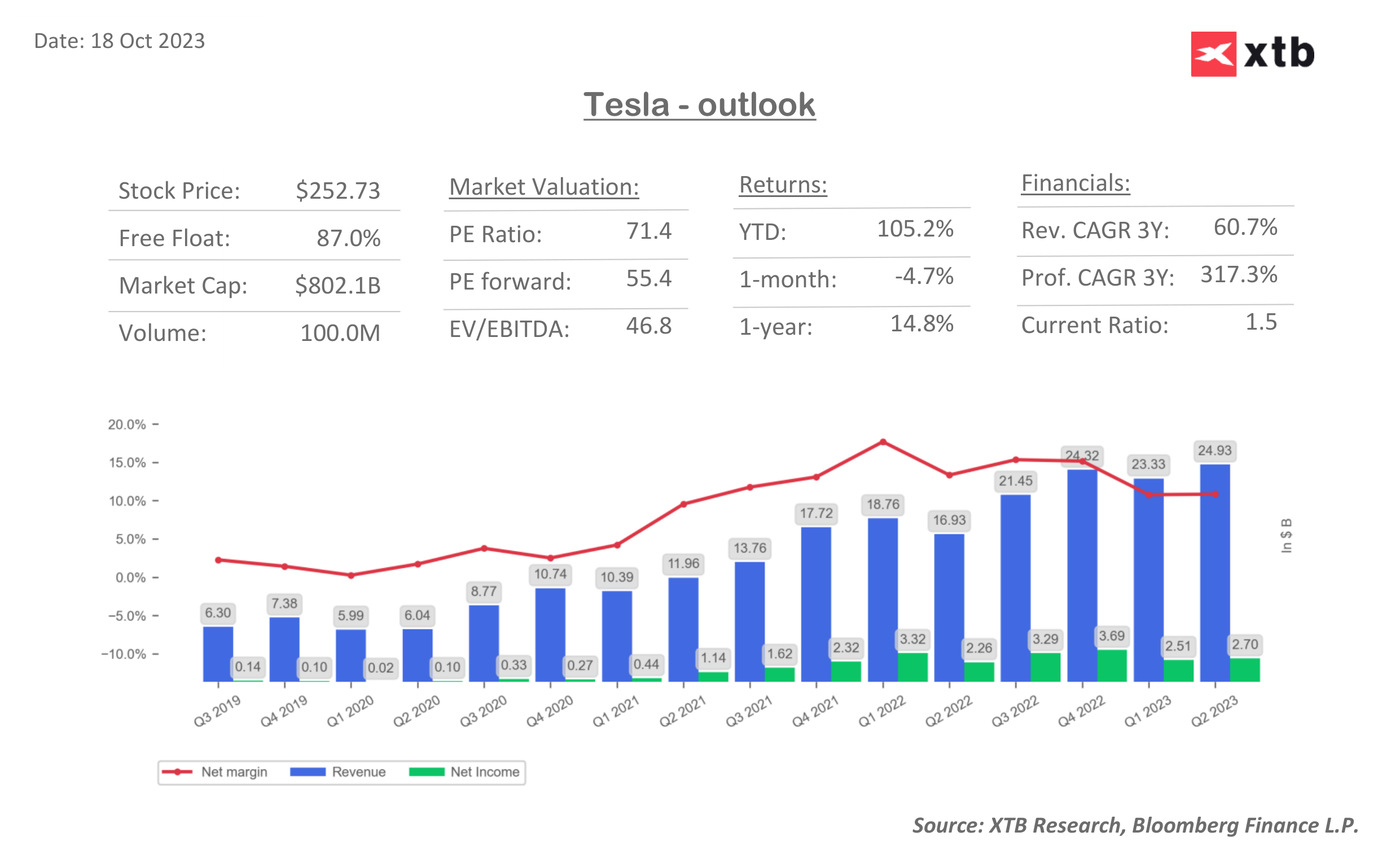 Após o fecho da sessão de Wall Street, vamos conhecer os resultados do maior fabricante de automóveis eléctricos dos EUA, a Tesla (TSLA.US). O mercado prestará atenção principalmente às margens brutas da empresa, que provavelmente cairão como resultado dos cortes nos preços para o Modelo Y e o Modelo 3 ao longo do terceiro trimestre. Para além das margens, os investidores também estarão atentos à quota de mercado, que caiu de 86 para 60% nos EUA desde 2018, agora face à crescente concorrência de outros fabricantes de automóveis. As perspectivas da empresa para o último trimestre do ano também serão importantes.