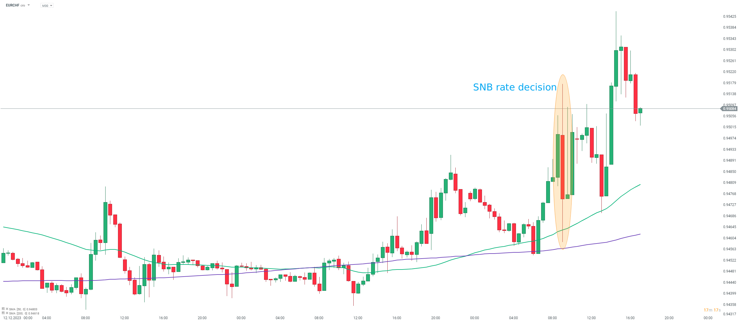 EURCHF caiu após a decisão da taxa SNB, mas recuperou todas as perdas mais tarde, com o EUR a ganhar após a reunião do BCE. Fonte: xStation5
