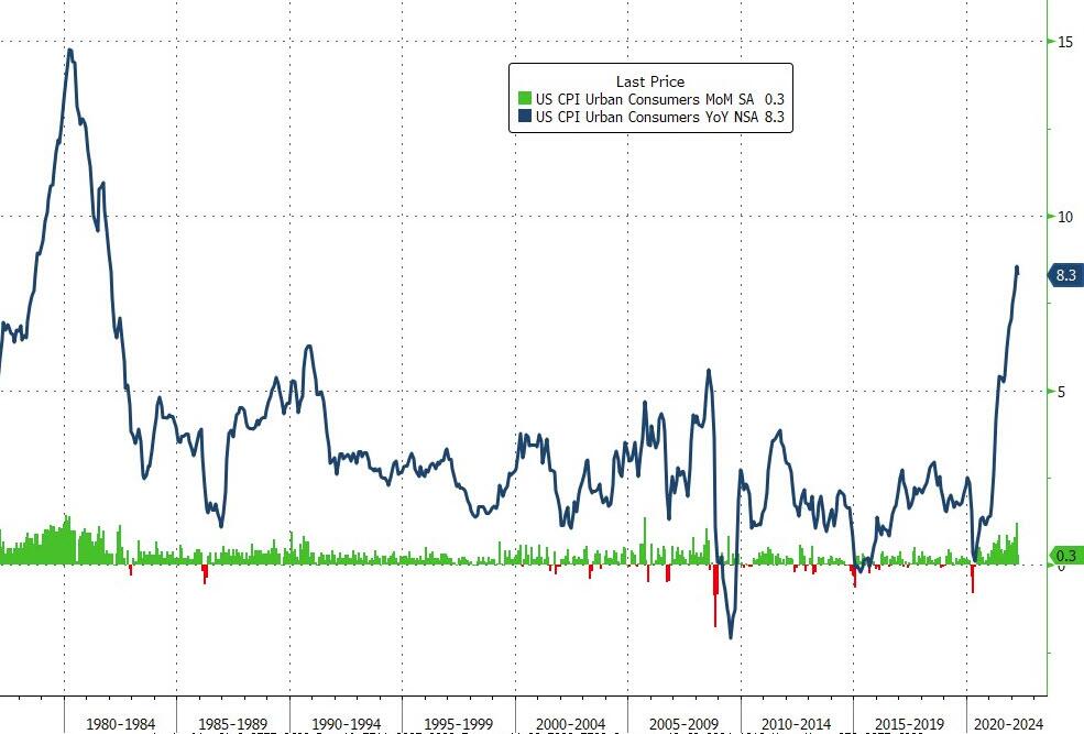 A inflação do consumidor americano em Abril diminuiu ligeiramente para 8,3% em relação ao mesmo período do ano passado, marcando o segundo mês consecutivo de inflação acima de 8%. Fonte: Bloomberg via ZeroHedge