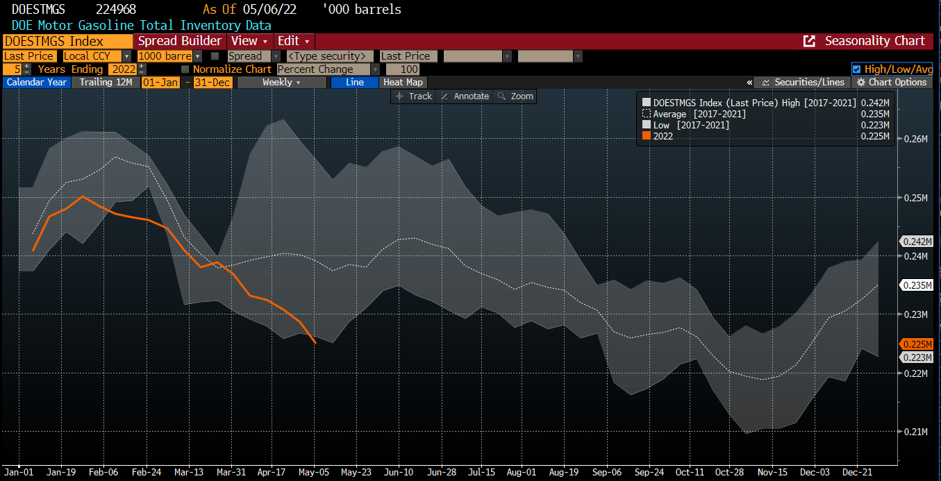 - A procura dos EUA parece forte antes da temporada de Verão, com as reservas de gasolina a permanecerem abaixo da média de 5 anos