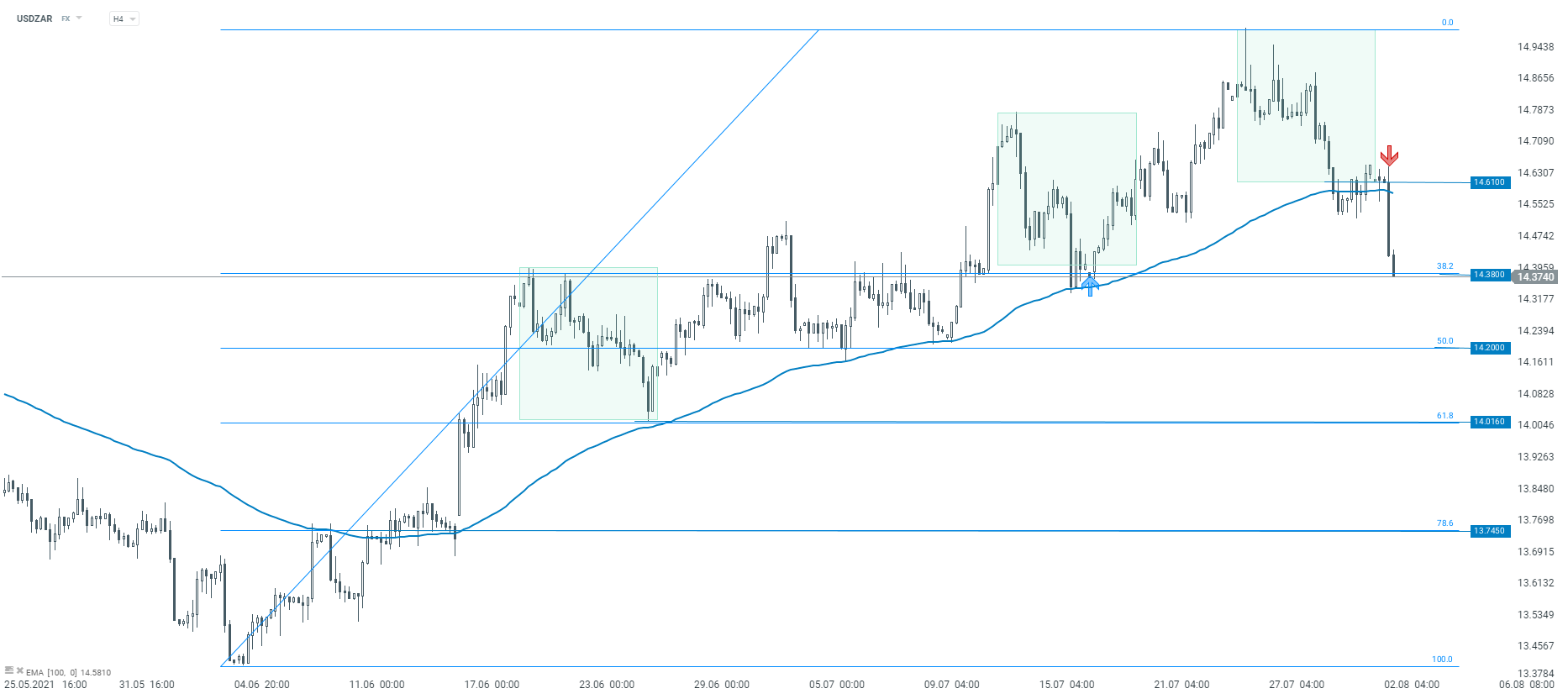 USDZAR segue pressionado em baixa, depois de ter quebrado abaixo da EMA de 100 períodos a gráfico de 4 horas.O par aproxima-se da zona de suporte marcada pela retração dos níveis de Fibonacci nos 38,2%. Fonte: xStation5