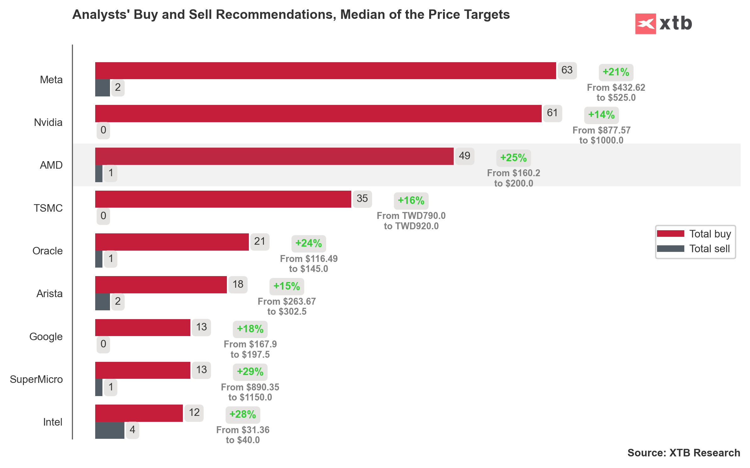 As recomendações dos analistas para a AMD permanecem relativamente positivas em comparação com outras empresas do setor. A recomendação mediana indica um aumento potencial de 25% no valor das ações, para cerca de US$ 200.