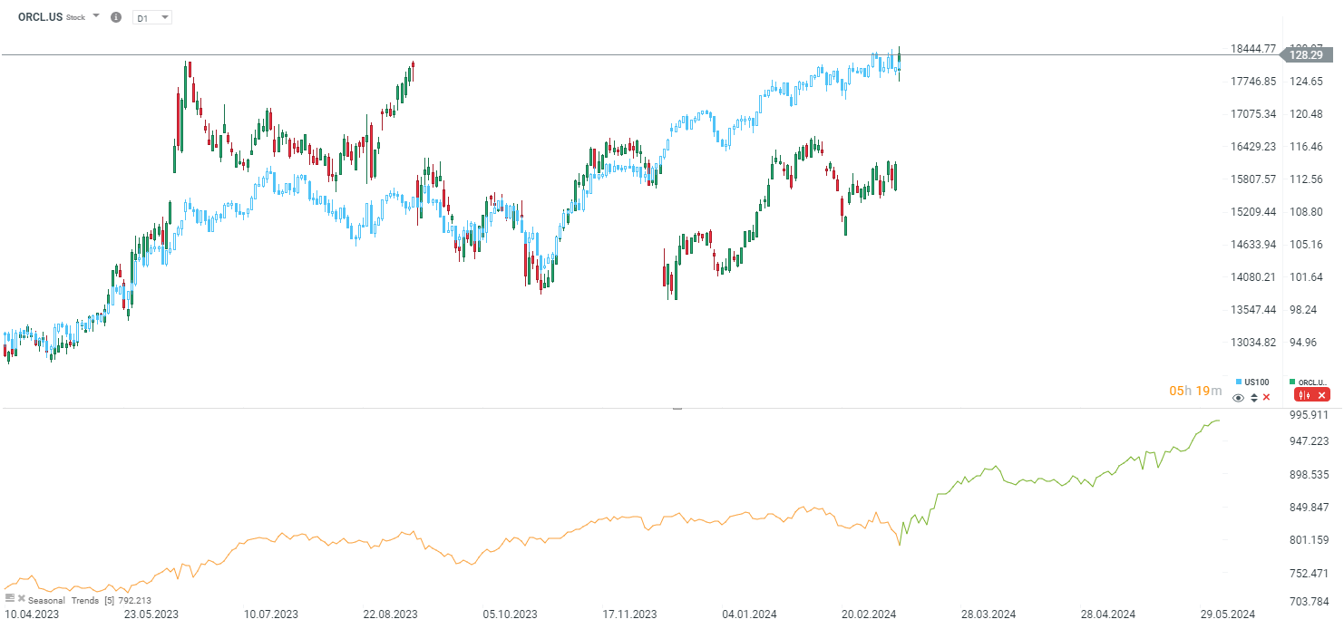 É importante notar que o preço das ações da Oracle tem sido negociado lateralmente desde o verão de 2023. No entanto, está atualmente a fechar o gap com o índice Nasdaq e a ultrapassar os máximos históricos anteriores. Se fechar acima dos $127,4 por ação, serão atingidos novos níveis recorde. As ações da empresa estão a subir mais de 10% hoje. Fonte: xStation5.