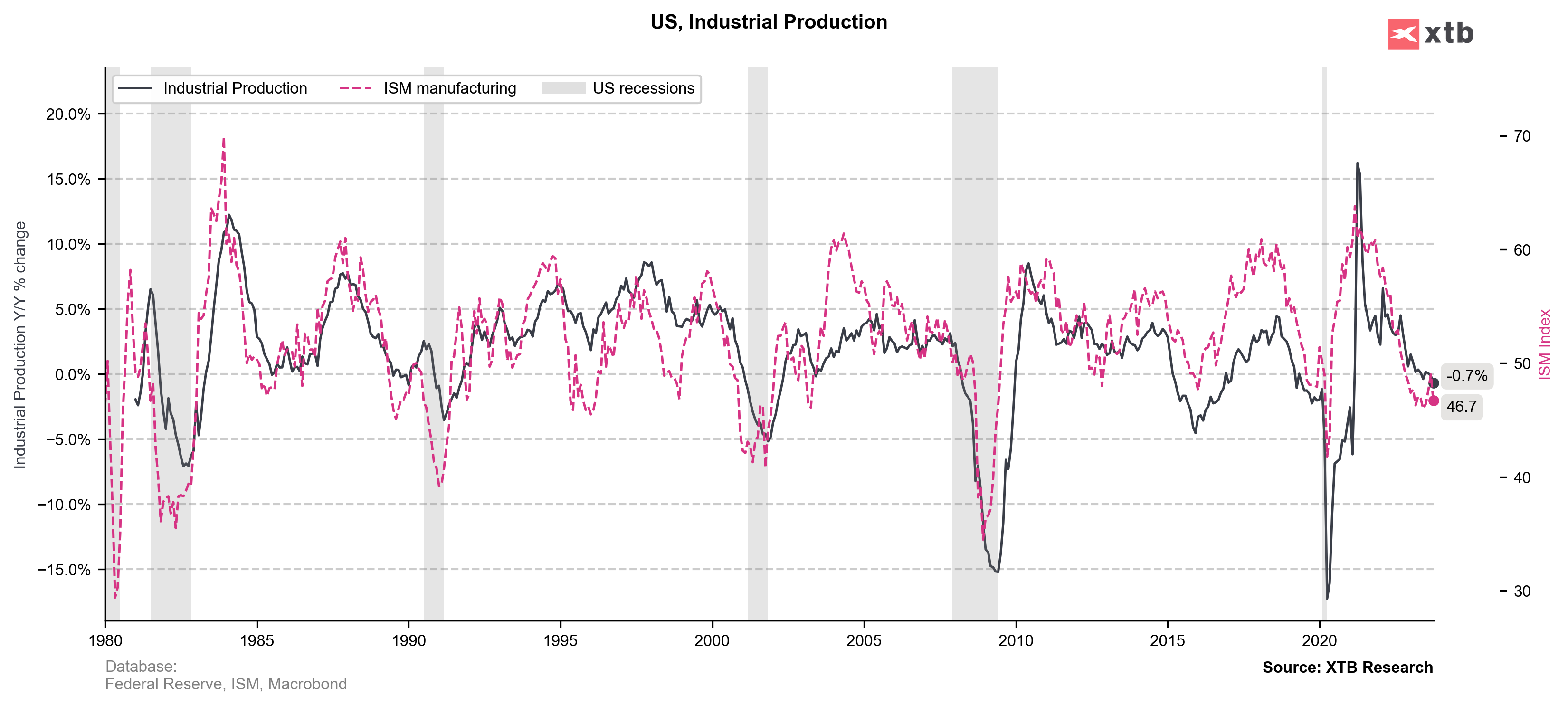 A produção industrial diminuiu 0,6 por cento em outubro. A produção industrial caiu 0,7 por cento. Grande parte deste declínio deveu-se a uma queda de 10% na produção de veículos automóveis e peças que foi afetada por greves em vários dos principais fabricantes de veículos automóveis. A produção dos principais grupos de mercado foi mista em outubro, com a queda na produção de veículos automóveis e peças a exercer uma pressão descendente sobre várias categorias. Os dados publicados confirmam a suspensão da subida das taxas de juro pela Fed, à medida que a economia dos EUA abranda.
