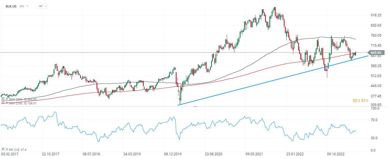 Ações da BlackRock (BLK.US), intervalo W1. As ações da empresa mantêm uma linha de tendência ascendente e estão a um preço significativo, medindo contra a média das 200 sessões no intervalo W1. Uma queda abaixo dos $670 poderia anunciar uma fraqueza mais ampla, no entanto, as ações estão a ganhar força. Fonte: xStation5