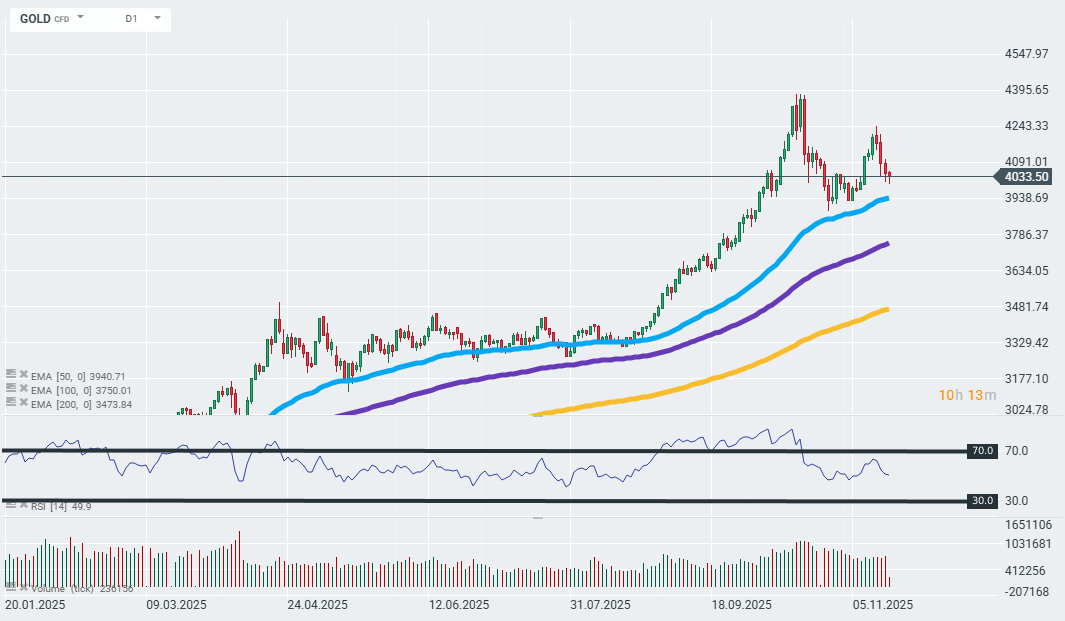 O ouro mantém sua tendência de alta de longo prazo. A EMA de 50 dias (curva azul no gráfico), que não foi testada novamente pelo mercado desde agosto deste ano, pode permanecer como um importante nível de suporte técnico. Fonte: xStation