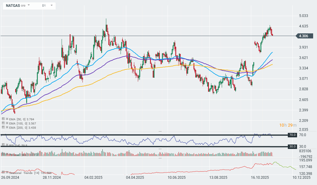 Tecnicamente, o NATGAS mantém uma tendência de alta no médio prazo, mas um ambiente fundamental relativamente desfavorável poderia, teoricamente, pressionar o instrumento no longo prazo, a menos que ocorram mudanças repentinas nos dados. Fonte: xStation