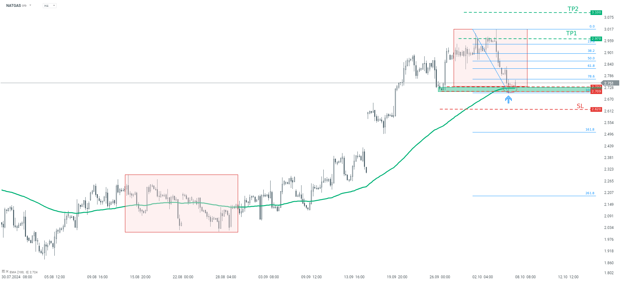 Opinião: O NATGAS tem sido negociado em um movimento ascendente recentemente. No entanto, o preço sofreu uma correção descendente local recentemente. Olhando para o intervalo H4 de um ponto de vista técnico, pode-se ver que os compradores conseguiram interromper o movimento descendente em um suporte chave. A área verde no gráfico abaixo é marcada com o limite inferior da estrutura 1:1 e reações de preço anteriores. De acordo com a estratégia Overbalance, a continuação de um movimento ascendente é o cenário do caso base.