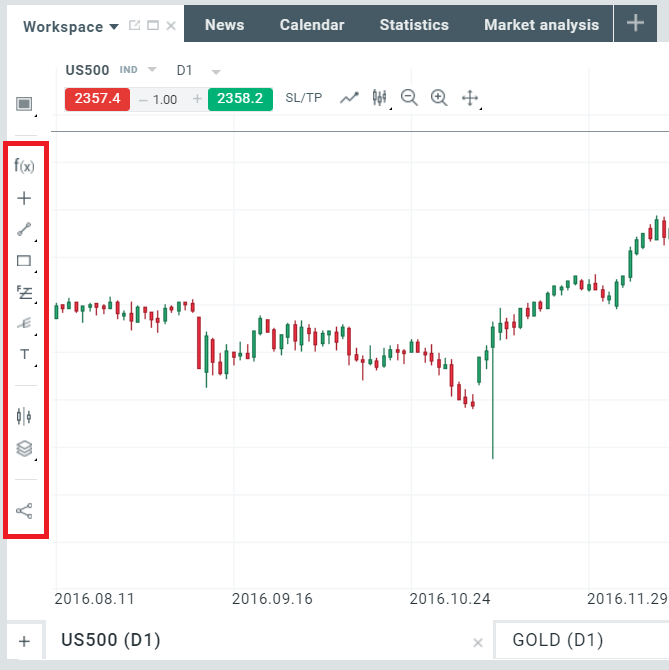Para aplicar um elemento de análise técnica, basta utilizar a barra de ferramentas no lado esquerdo do gráfico.