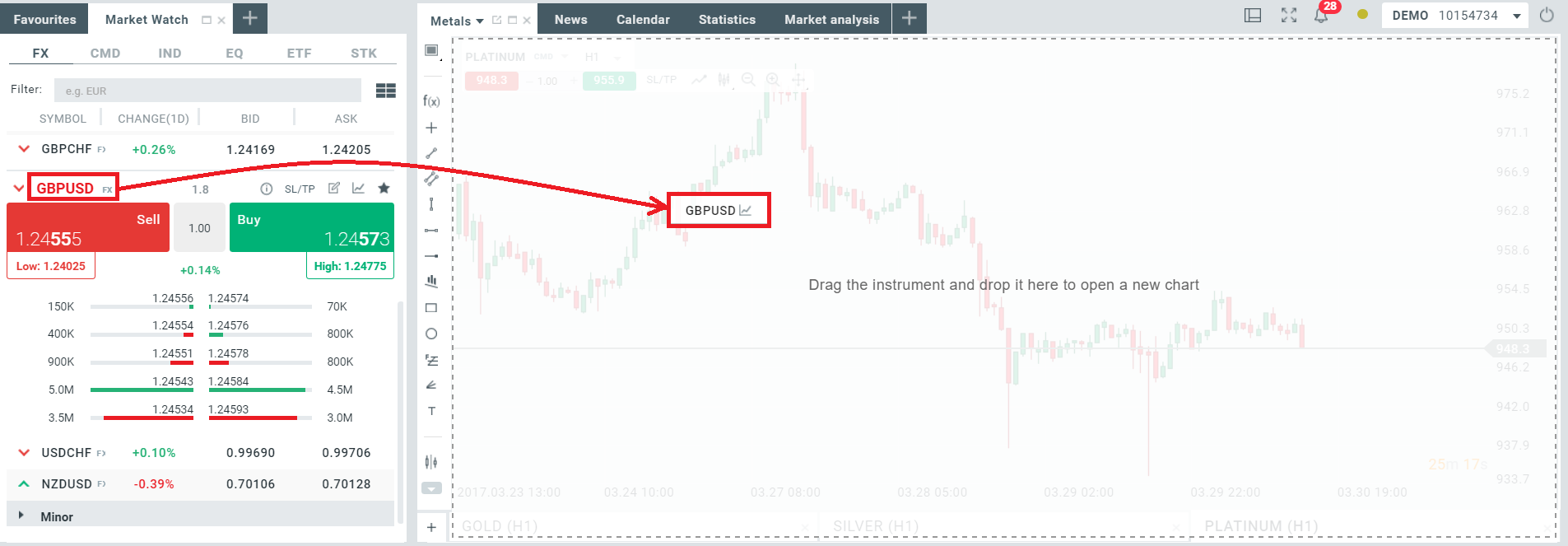 Se quiser apenas substituir um gráfico sem adicionar um novo, basta simplesmente “arrastar e largar” esse gráfico, arrastando o nome do instrumento do módulo Janela de mercado para qualquer área de gráfico.
